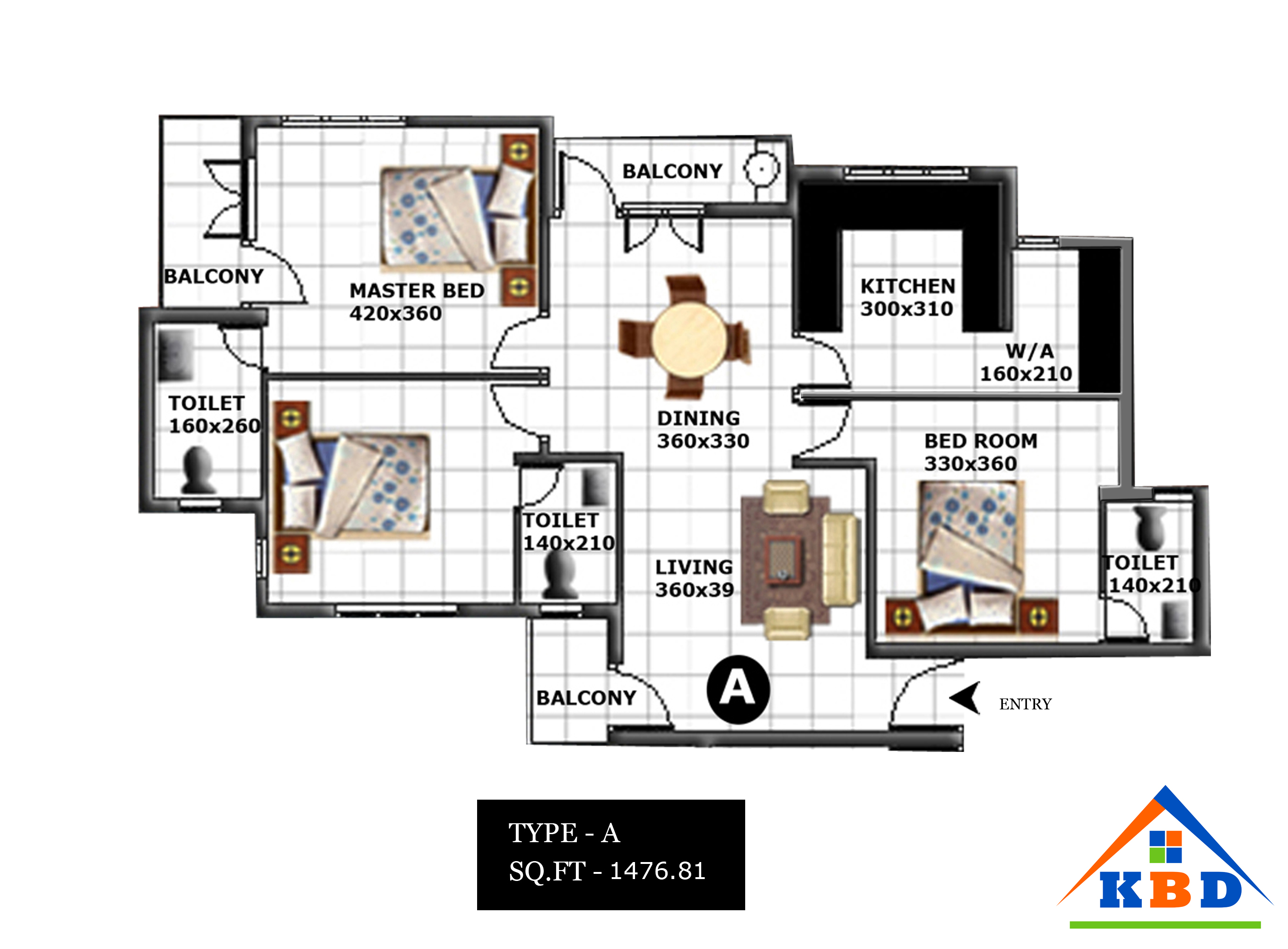 Vitrified tiles flooring in living, dining, kitchen and in all bedrooms except toilet. Counter with granite top and stainless steel sink. Glazed tiles above the counter to a heights of 45 cms